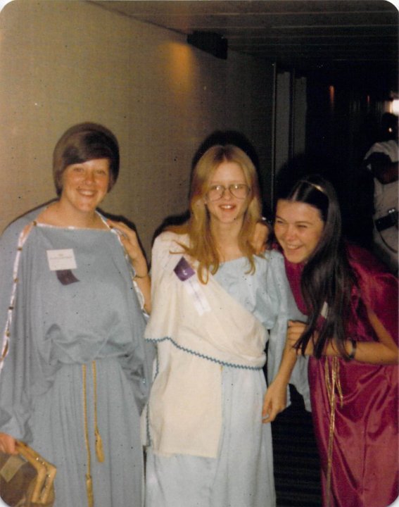 This is me in my toga for Latin trip to Orlando when I was a senior in high school.  I thought I was FAT- what the heck??  LOL!  I am the one in red.  My friend posted it on facebook today.  She is the one in the middle.   I was in Latin 4, she was in Latin 3 and the third chica was in Latin 2.  We had a blast!